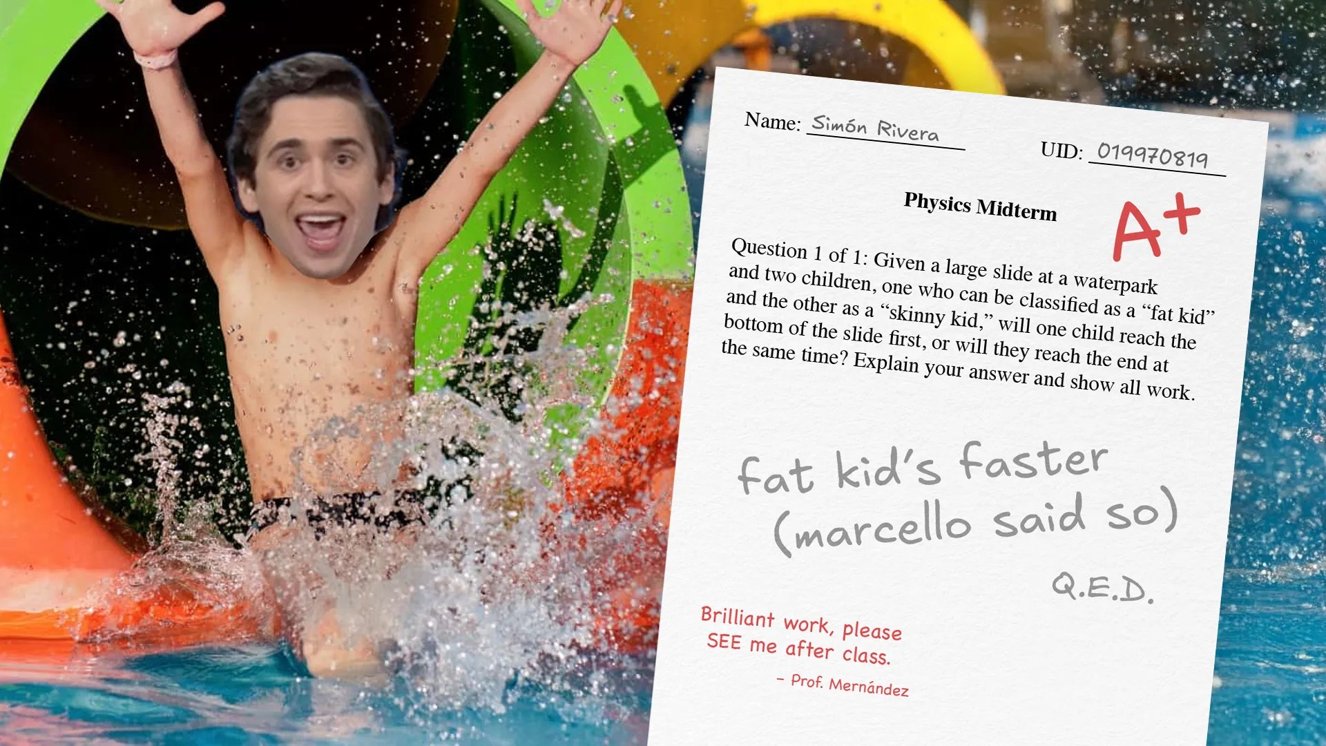 Others were not so sure that the fat kid really would’ve reached the end of the waterslide faster. We spoke to one of Rivera’s classmates, Douglass Smunklepop, who did not pass the single-question midterm on the physics of the waterslide. Smunklepop offered us his explanation of the problem, unprompted.